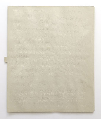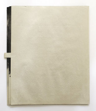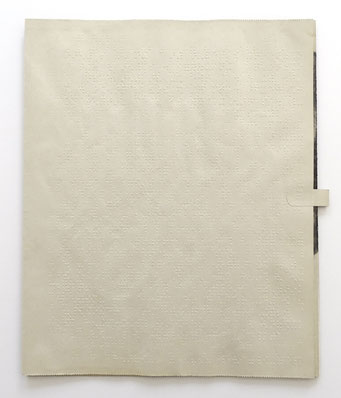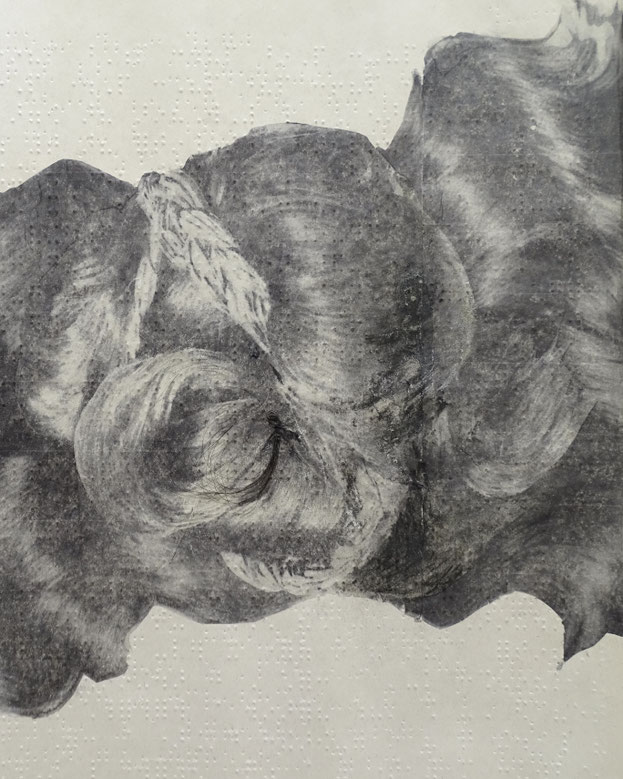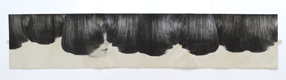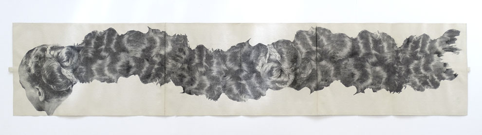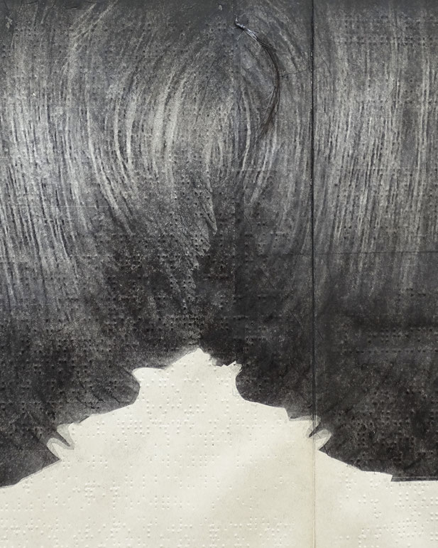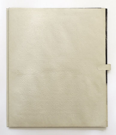 La peau semée de grains de beauté d'un cahier braille me faisait signe sur l'étalage d'un bouquiniste. Ces petits grains incompréhensibles sollicitaient irrésistiblement le toucher. Comme sur un vélin précieux j'ai tatoué des chevelures aux ondulations érotiques qui appellent la caresse du bout des doigts. Dans le secret des plis en accordéon, j'ai inséré comme un puissant fétiche, une mèche de cheveux naturels en référence au roman de Guy de Maupassant : La chevelure. Son héros découvre une tresse de cheveux féminins cachées dans un meuble ancien. Celle-ci devient l'objet d'une passion amoureuse dévorante qui le conduit à la folie.