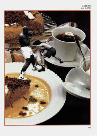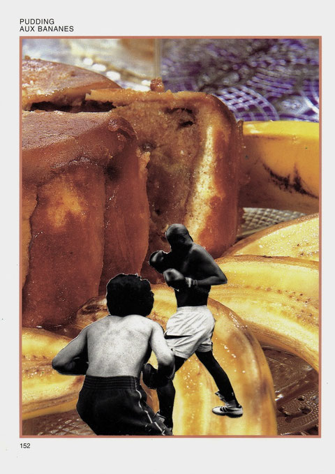 Éléments extraits d'un album trouvé, collés sur pages de livres de cuisine vintage.